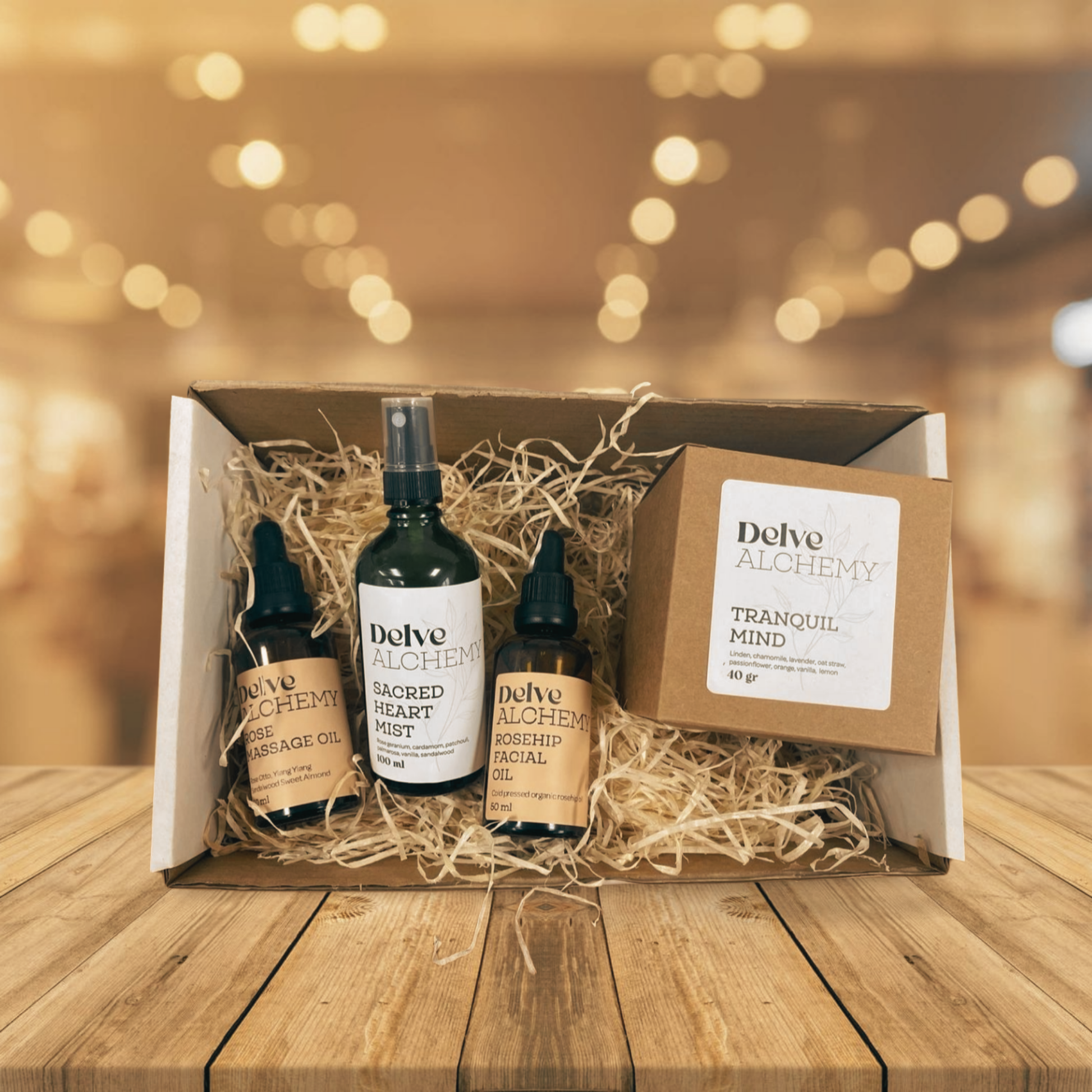 The set pairs skincare regeneration (pure rosehip oil for face) with sensual body care (rose absolute massage oil) and aromatic tranquility (Sacred Heart mist with rose geranium and vanilla). Tranquil Mind tea completes the ritual, calming from within. Rose threads through every element—from wild rose seeds to precious rose absolute.