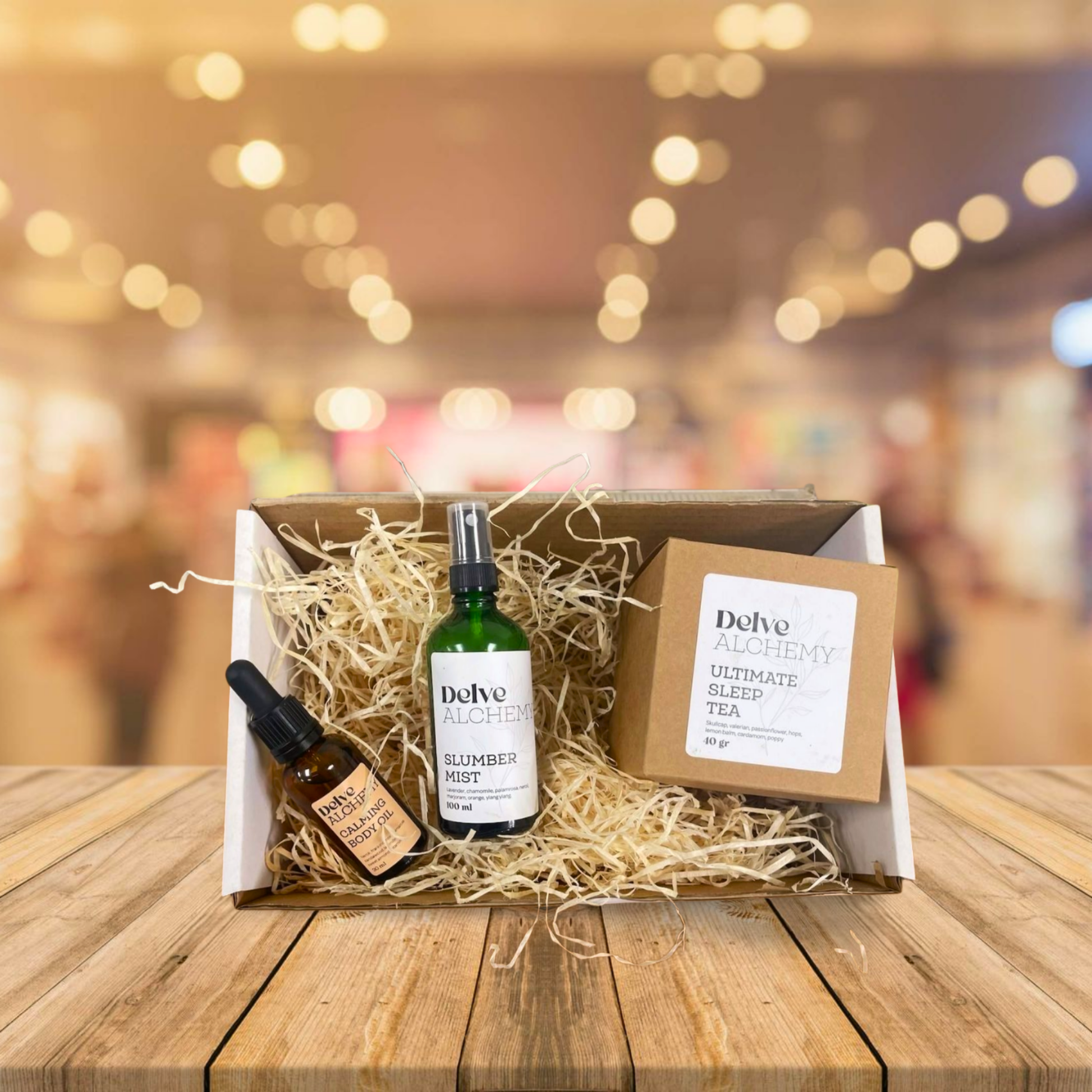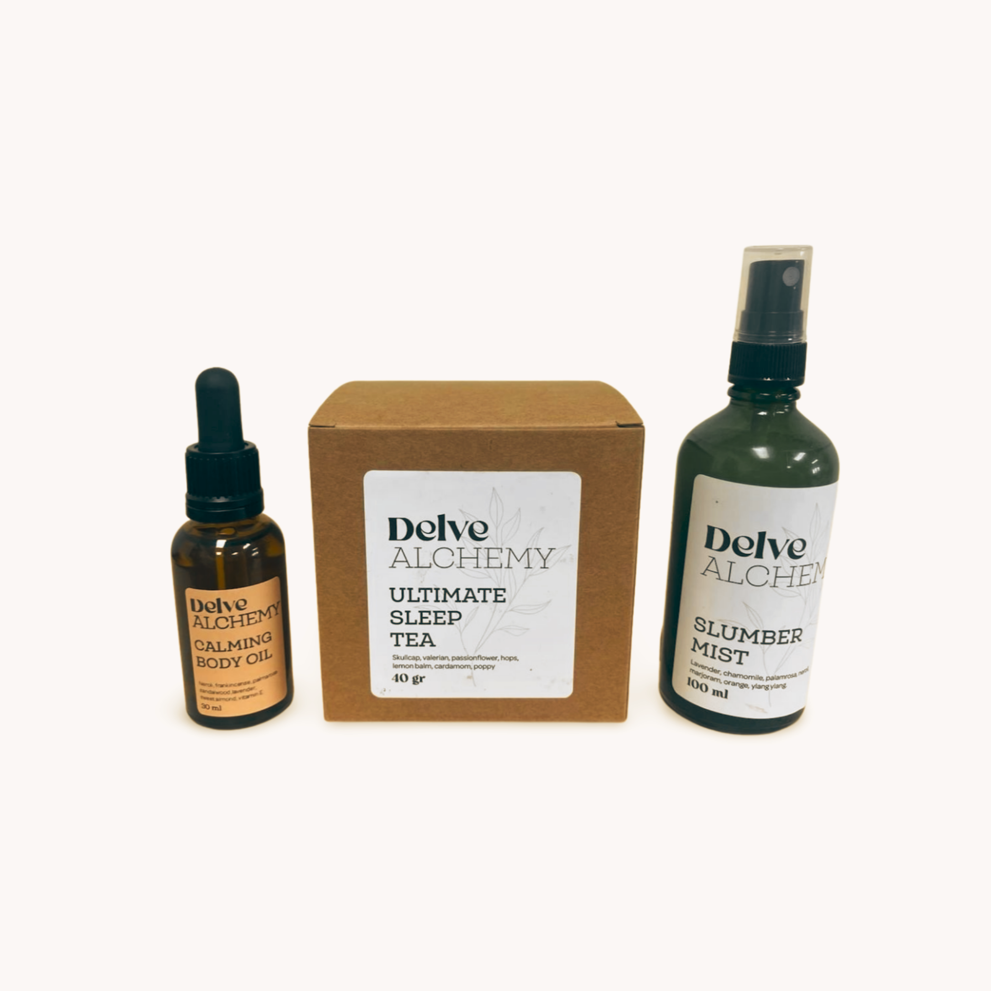 The kit pairs our powerful Ultimate Sleep Tea (seven nervine herbs for neural calm) with our Calming Body Oil (neroli, frankincense, lavender) and Slumber Mist (French lavender and chamomile pillow spray). Together, they address sleep from every angle: calm your space, relax your body, quiet your mind.